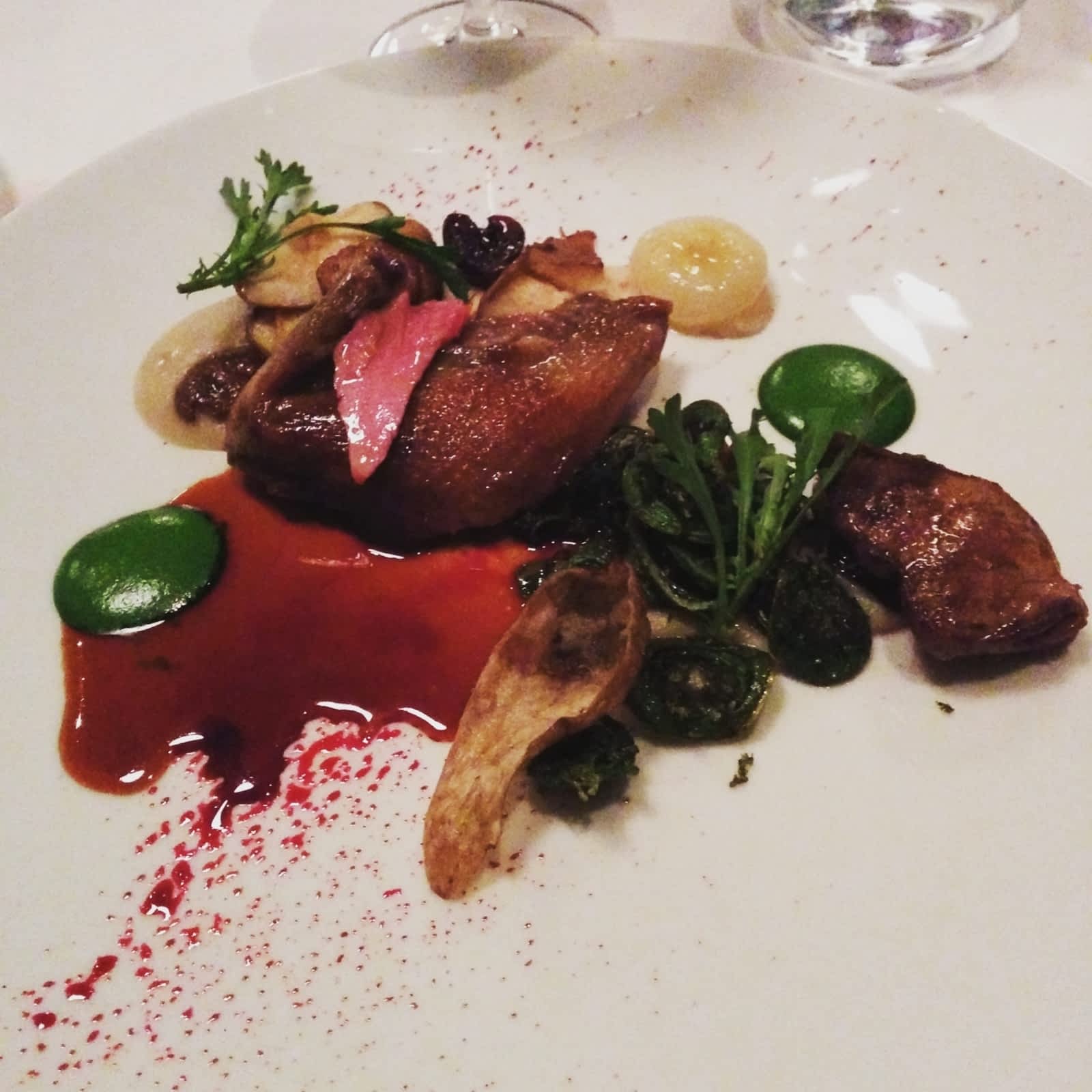 têtes de violon, pleurotes, purée de topinambours, sauce au cassissier