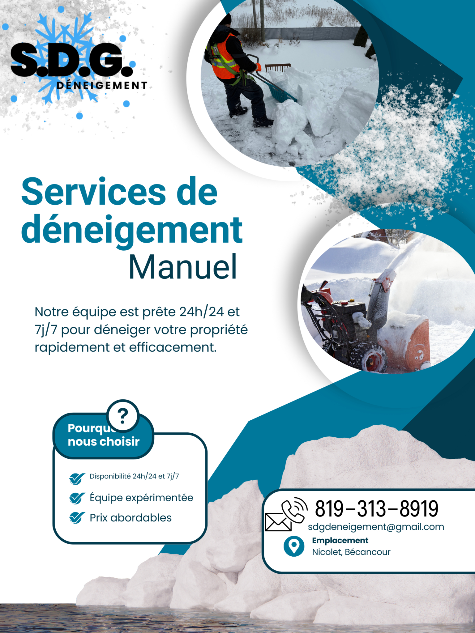 SDG Déneigement Manuel est une entreprise locale spécialisée dans le déneigement résidentiel et commercial, offrant un service fiable, rapide et minutieux. Notre mission est de rendre vos hivers plus sécuritaires et agréables en assurant un dégagement complet et efficace de vos entrées, trottoirs et stationnements, sans endommager vos surfaces.